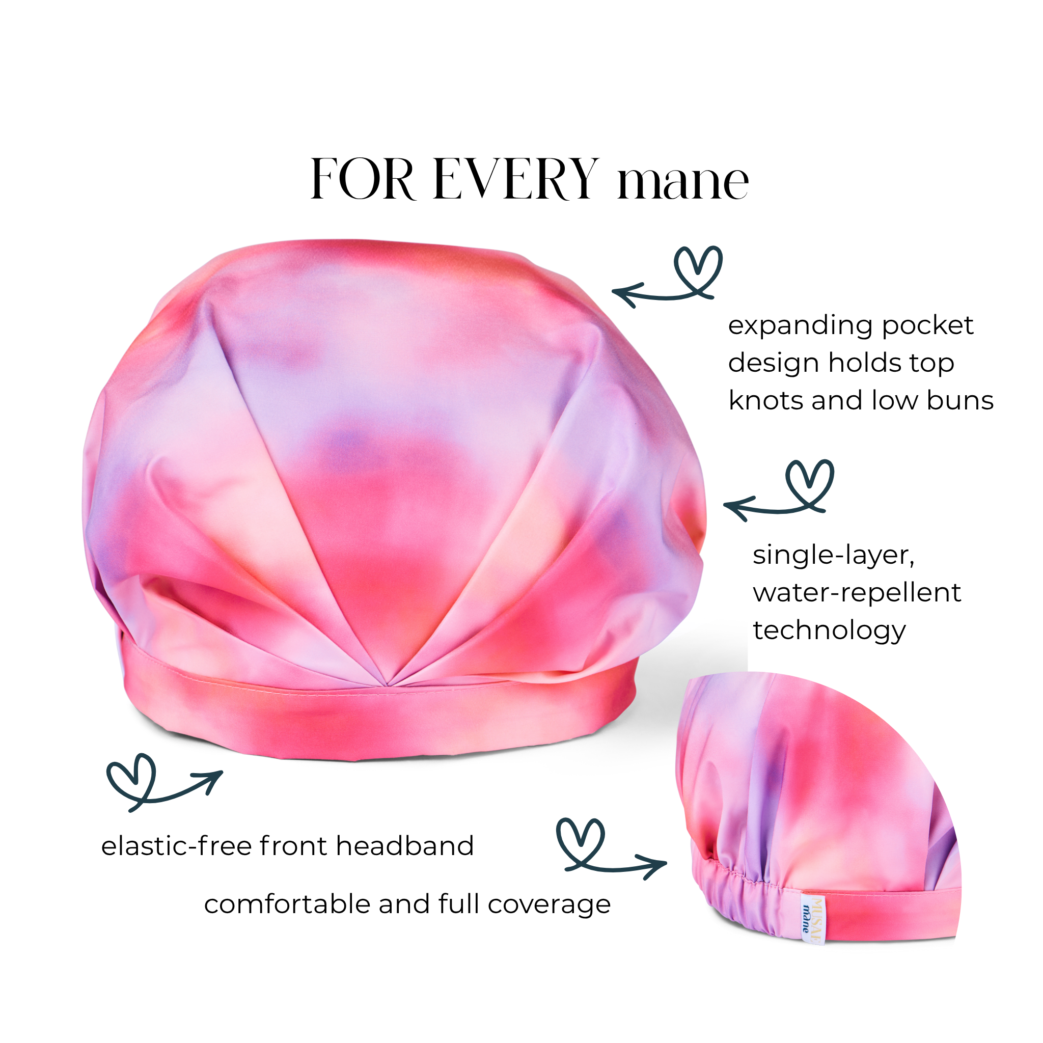 Protect your mane with MUSAE Mane Shower Cap's single layer water-repellent fabric technology. Guarding your locks against moisture and frizz-inducing humidity, MUSAE Mane shower cap helps prolong your style between washes. Skipping the daily wash supports a healthy scalp and luscious mane.